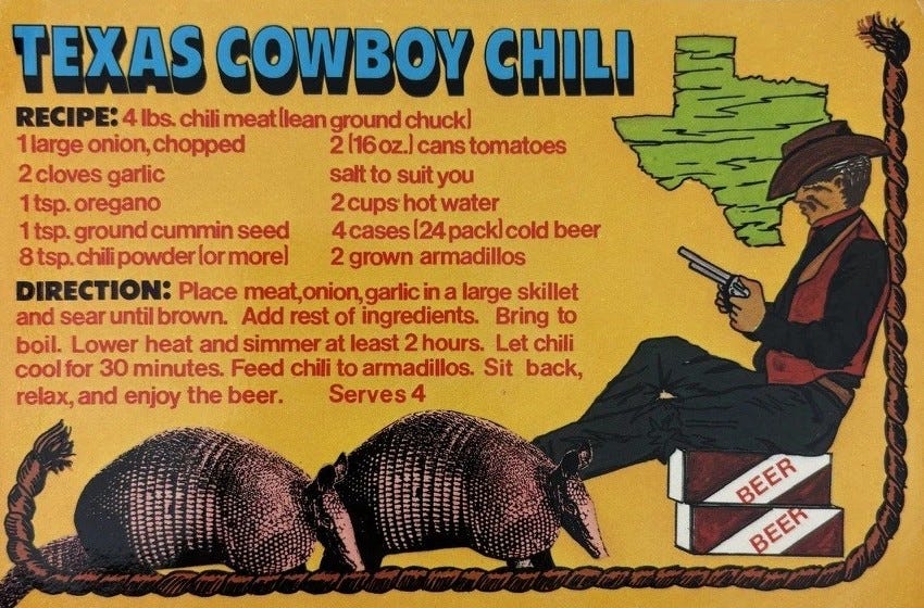 As any true Texian knows, chili is good any time of the year. But it is especially good on those rare fall days when it’s actually cool and maybe even cold. The recipe on this vintage postcard, published by an old-time Amarillo postcard company no longer in business, is decent enough until you get to the end and see what the gag writer suggests. Though meant as a disparagement of this Texas delicacy, giving chili to an armadillo would be an act of kindness.
